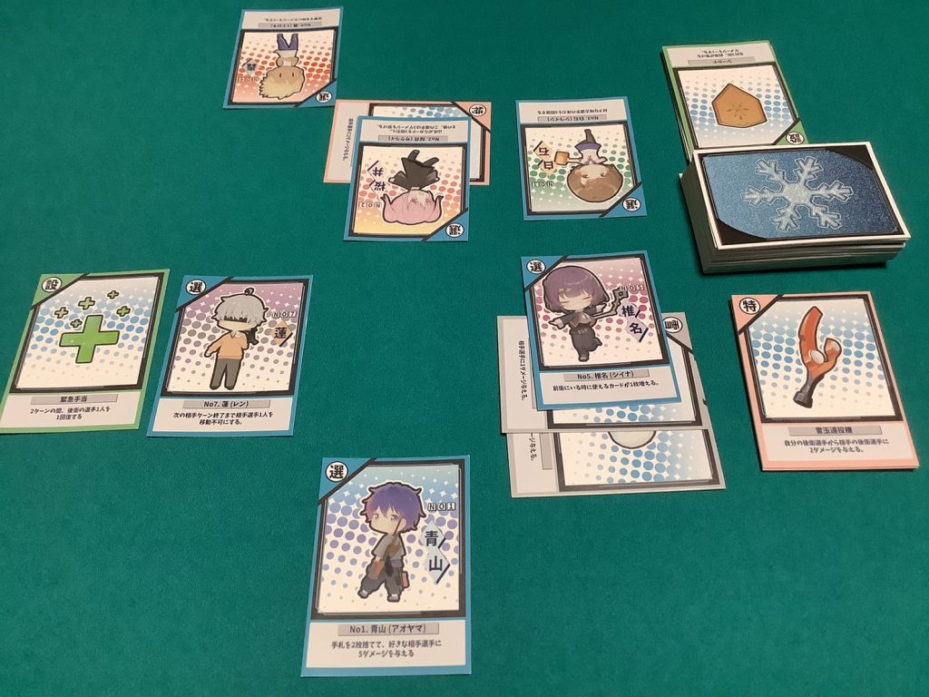 - 雪玉カード・特殊雪玉カード・設置カードを1つにまとめてシャッフルし、裏向きで重ねて山札にします。ゲームでは、各プレイヤーがこの山札から手札を補充します。