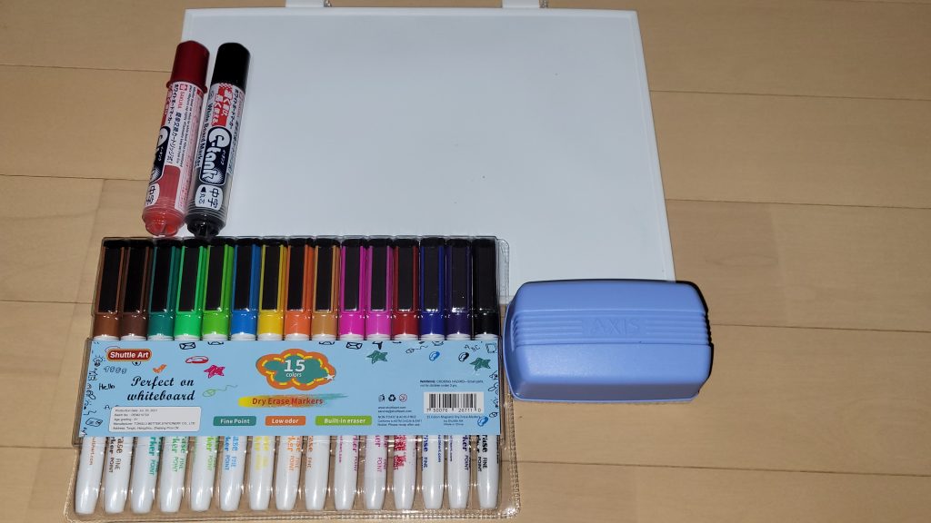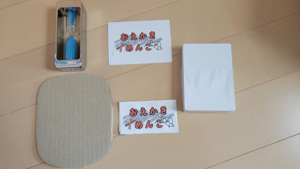 ホワイトボード×4 砂時計×1 めんこ×6 カラーペンセット×1 黒ペン×1 赤ペン×1ひっくり返すめんこ×1 お題カード×20(自分たちでお題を追加できるように)