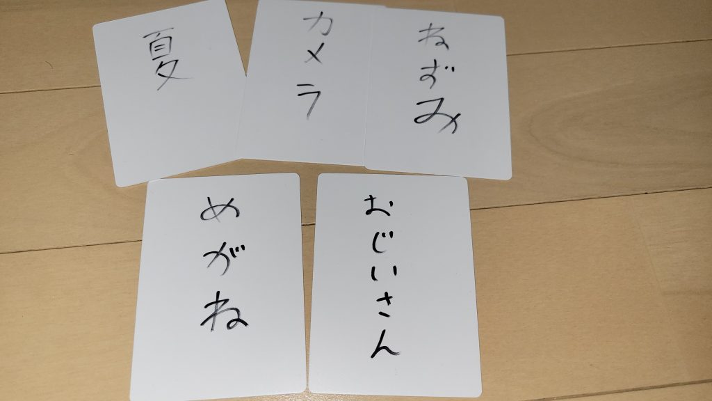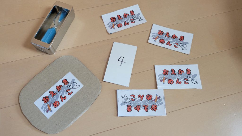 ・3 山札からめんこに書いている数字の順番のカードを上か下から引き、1番目の人だけがお題カードを見る