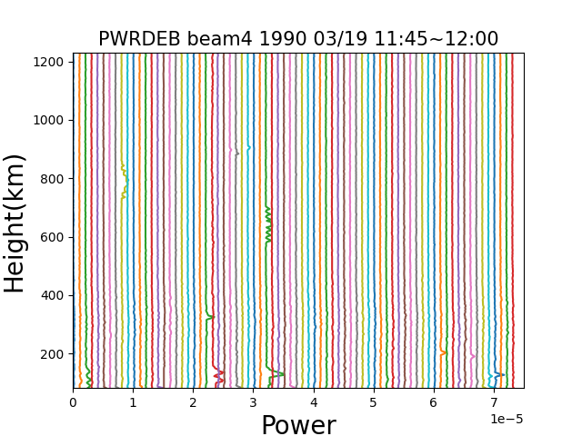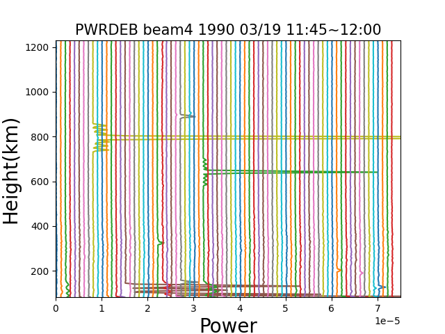 宇宙浮遊物の計数はデータのノイズをカウントすることで計数を測った。データには15秒に1回の観測データがあり、その一つ一つから1e-6(0.000006)以上の電子密度を除いていった。除いていった結果の一例をグラフにすると以下のようになる。グラフは1990年3月19日の11:45~12:00の15分間で、縦軸が高度、横軸が電子密度、15秒間隔のデータを電子密度方向に1e-6ずつずらしたグラフになっている。