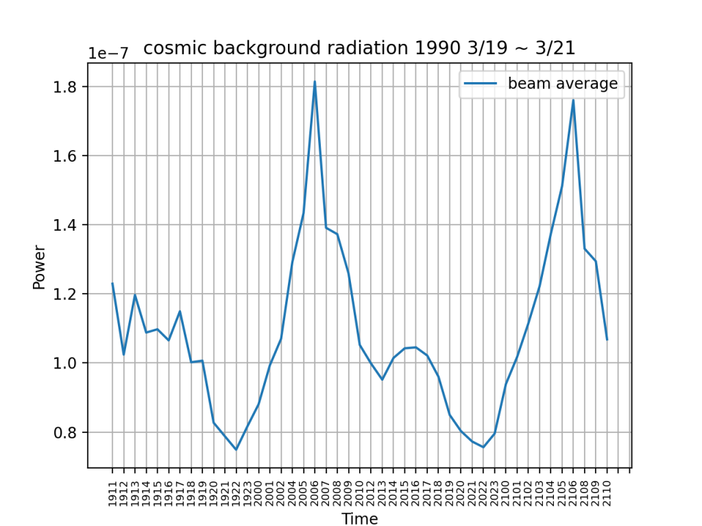 上のグラフは1990年3月19日から3月21日の4ビーム平均の宇宙背景放射日変動のグラフになっている。グラフから見て取れるように基本的に宇宙背景放射は午後に高くなって午前に低くなる傾向があることがわかった。