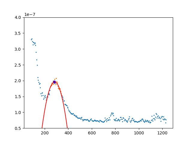 F層ピークを出すためにフィッティングを行った。二次関数でフィッティングを行うことで、一番高い値を得ることができる。200kmから400kmの範囲で一番大きい値から±20個のデータを取り、その値を使ってフィッティングを行った。