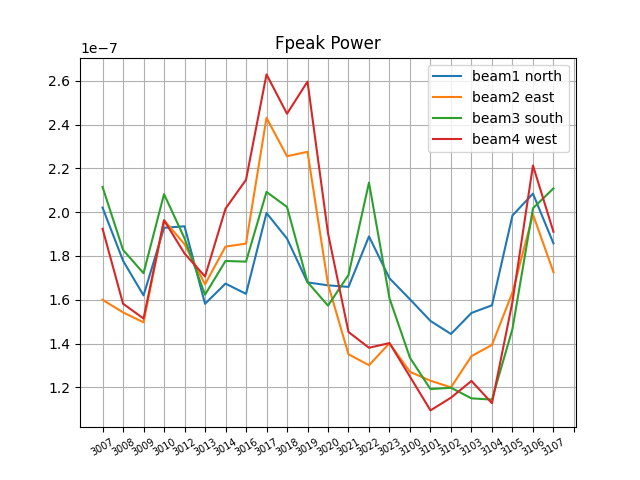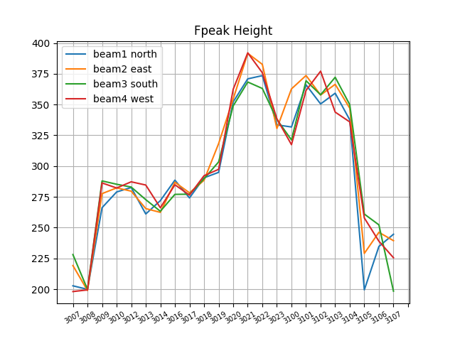 電子密度は方角によって値は変わっているが、どの方角も午前中に高くなり、午後に低くなっていることがわかる。一方高さはどの方角も同じ動きをしていて、午前中に低くなり、午後に高くなっていることがわかる。
