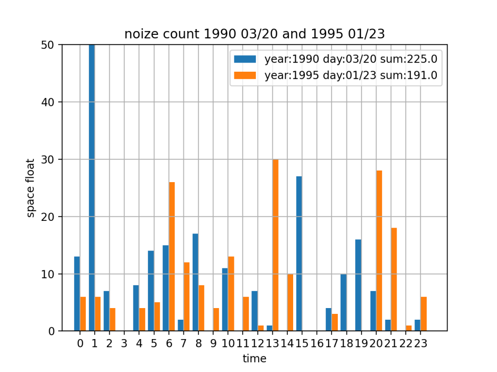 上のグラフは1990年3月20日と1995年1月23日の3日の日変動の比較のグラフである。私の考察では宇宙浮遊物は年々増加傾向にあり、その結果が可視化で見ることができると考えていた。しかし、結果は5年単位では大きな変化を見ることができなかった。