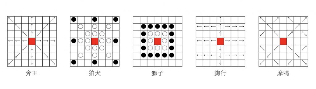 縦横無尽に駆け回る奔王、動かずに駒を取る狛犬と獅子、2回動くことができる鉤行と摩喝