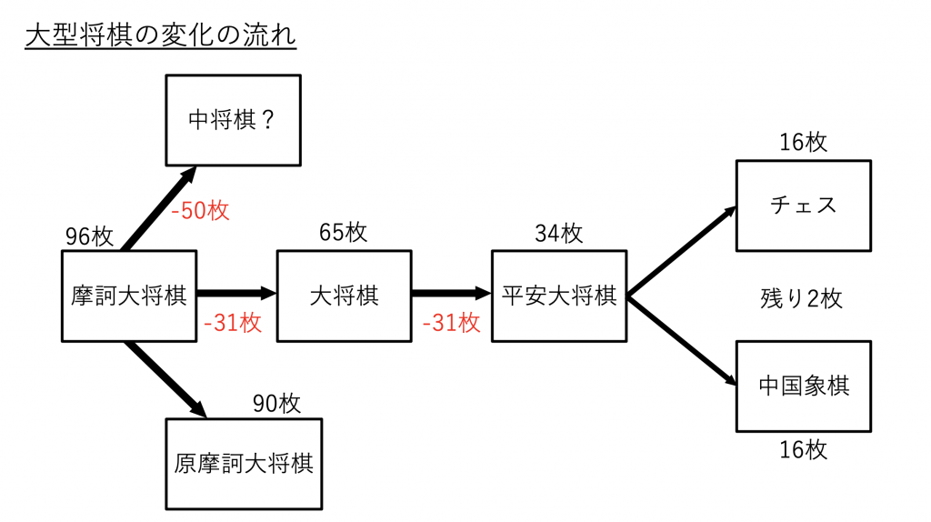 大型将棋といっても種類はいくつもありますがどれも知名度は低く、対局をしようと考えても相手が見つからないことがほとんどでした。また仮に大型将棋を知らない友人を誘ったとしても駒の多さに圧倒され興味を持つ前に挫折してしまうような状態でした。これでは対局者が増えず、大型将棋に対する議論も捗るようなことはあり得ないのではないかと考え、大型将棋をまずは知ってもらうために各種大型将棋の特徴や面白みといった遊戯性を考察し明らかにしようと考えました。
