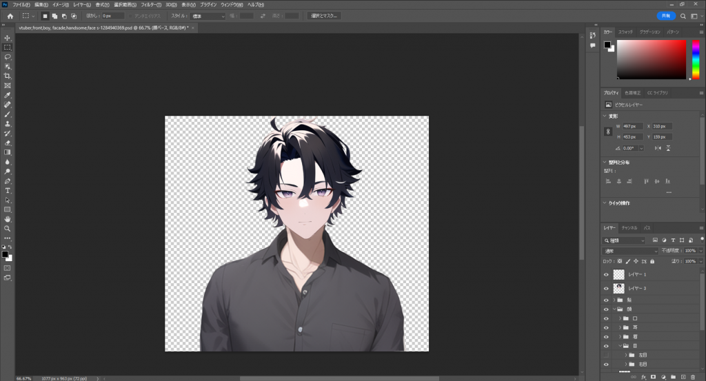 男性の正面の立ち絵を出力したかったのでfront,boy,facade,handsome,faceのような単語を徐々に増やしていき今回使用したような立ち絵を生成しました。